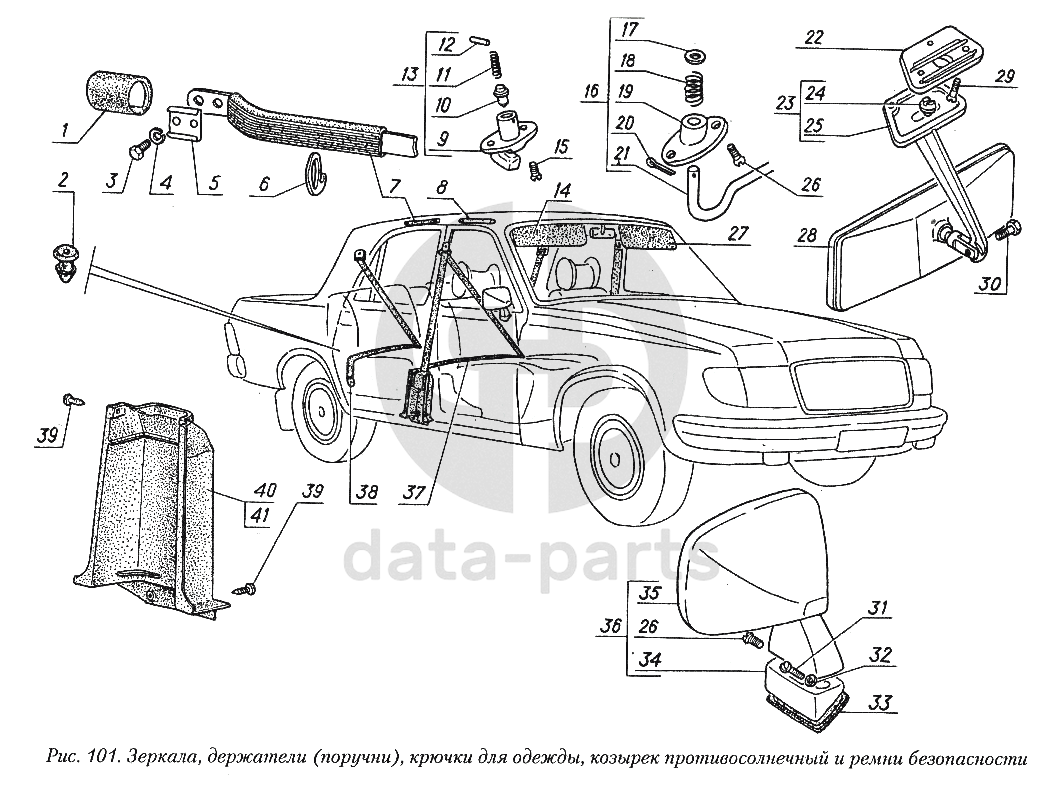 Зеркала, держатели (поручни), крючки для одежды, козырек противосолнечный и ремни безопасности ГАЗ-31029