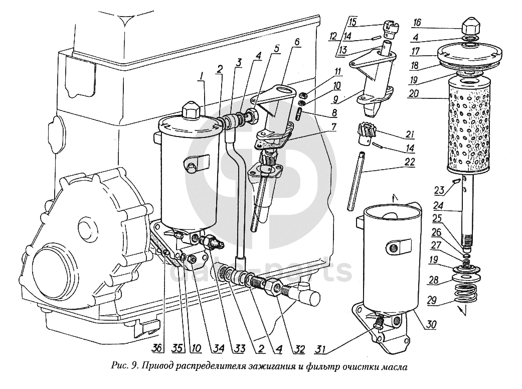 Привод распределителя зажигания и фильтр очистки масла ГАЗ-31029
