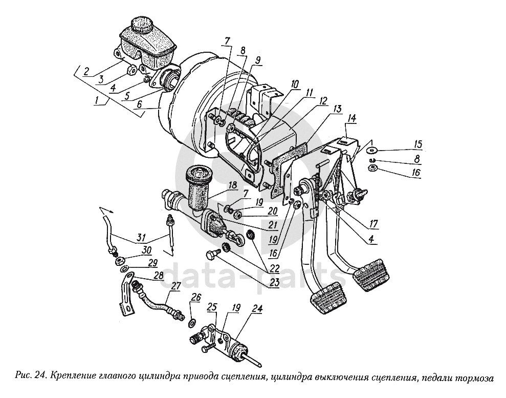 Крепление главного цилиндра привода сцепления, цилиндра выключения, педали тормоза ГАЗ-31029