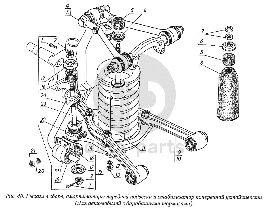 Рычаги в сборе, амортизаторы передней подвески и стабилизатор поперечной устойчивости (для автомобилей с барабанными тормозами) ГАЗ-31029