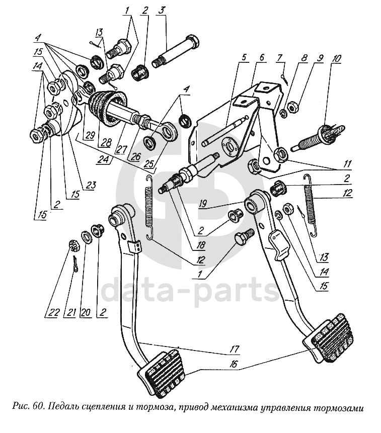 Педаль сцепления и тормоза, привод механизма управления тормозами ГАЗ-31029