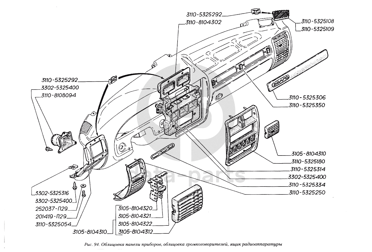 Облицовка панели приборов, облицовка громкоговорителей, ящик радиоаппаратуры ГАЗ-3110