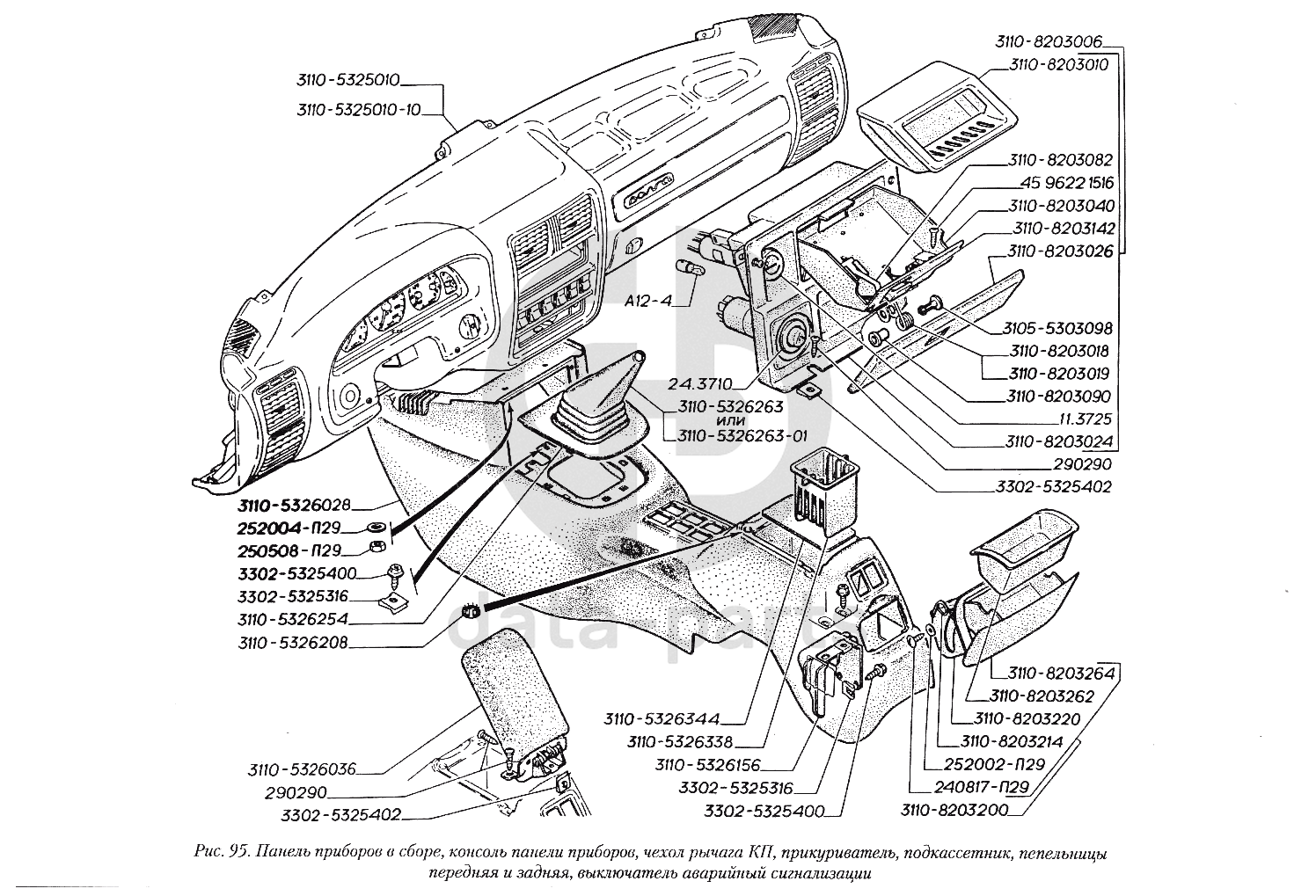 Панель приборов в сборе, консоль панели приборов, чехол рычага КП, прикуриватель, подкассетник, пепельницы передняя и задняя, выключатель аварийный сигнализации ГАЗ-3110