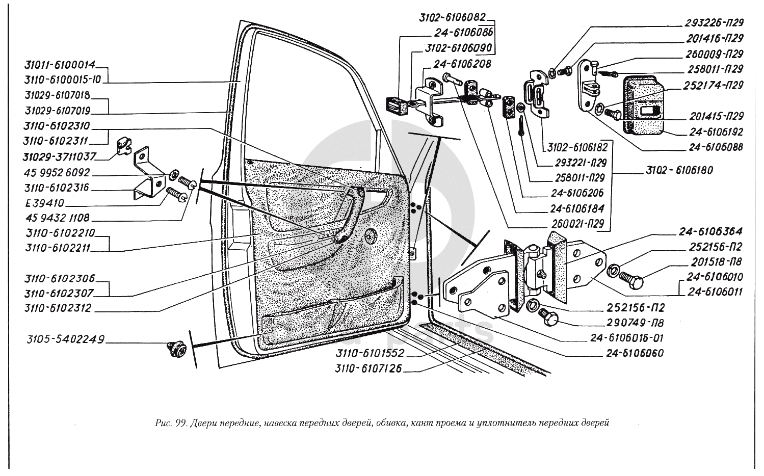 Двери передние, навеска передних дверей, обивка, кант проема и уплотнитель передних дверей ГАЗ-3110