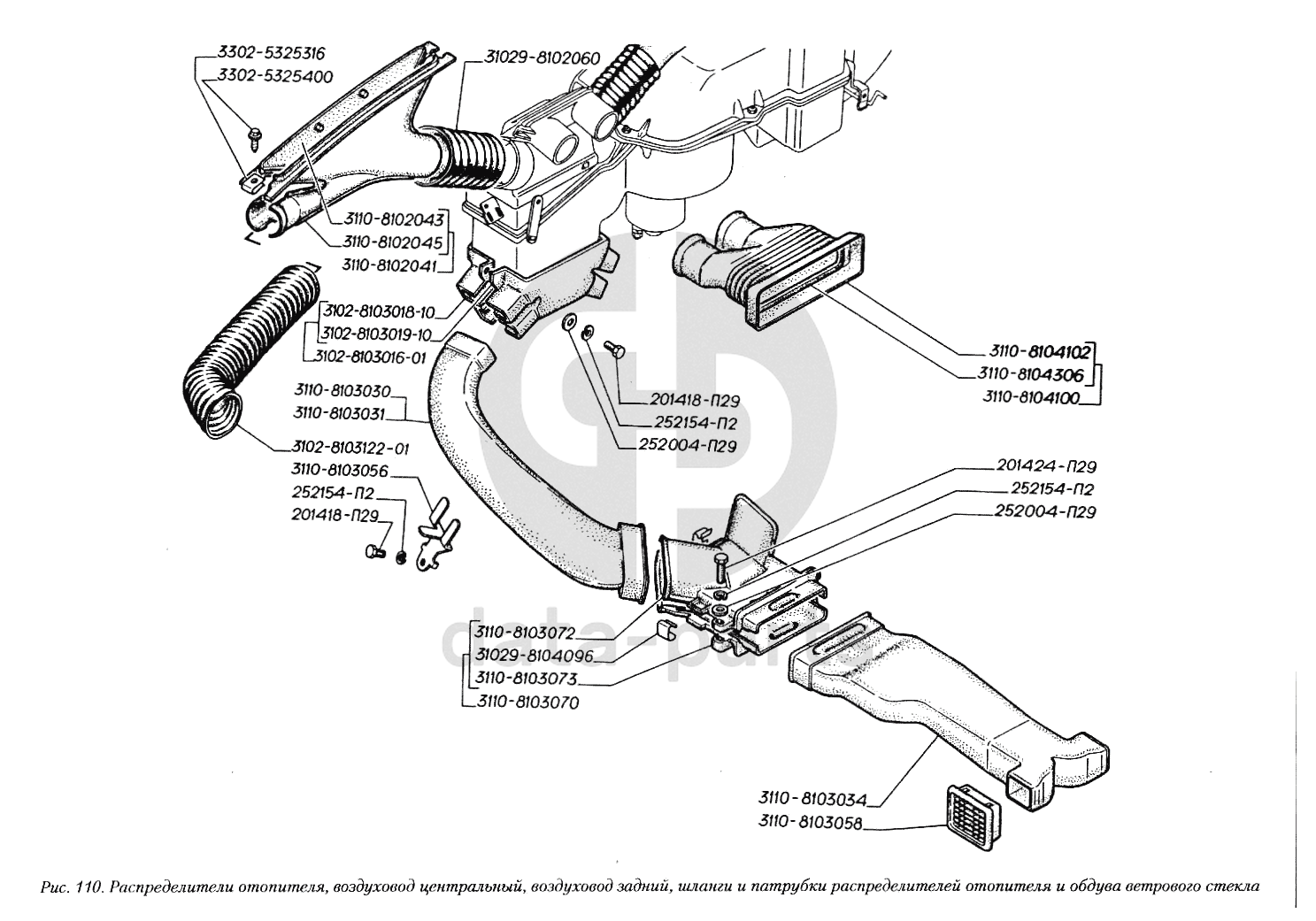 Распределители отопителя, воздуховод центральный, воздуховод задний, шланги и патрубки распределителей отопителя и обдува ветрового стекла ГАЗ-3110