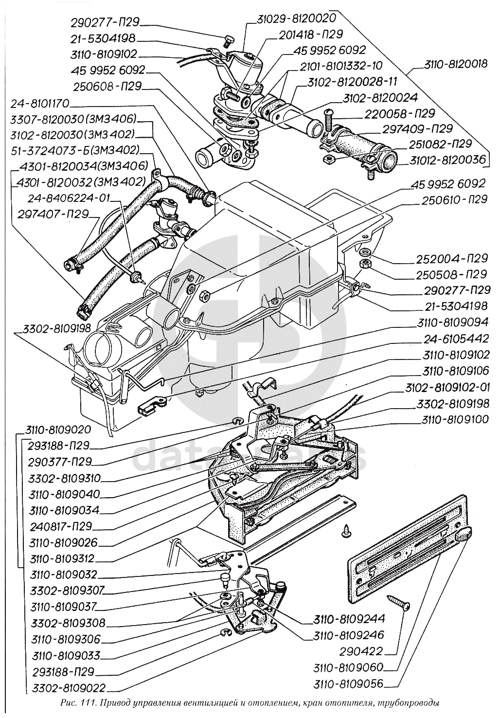 Привод управления вентиляцией и отоплением, кран отопителя, трубопроводы ГАЗ-3110