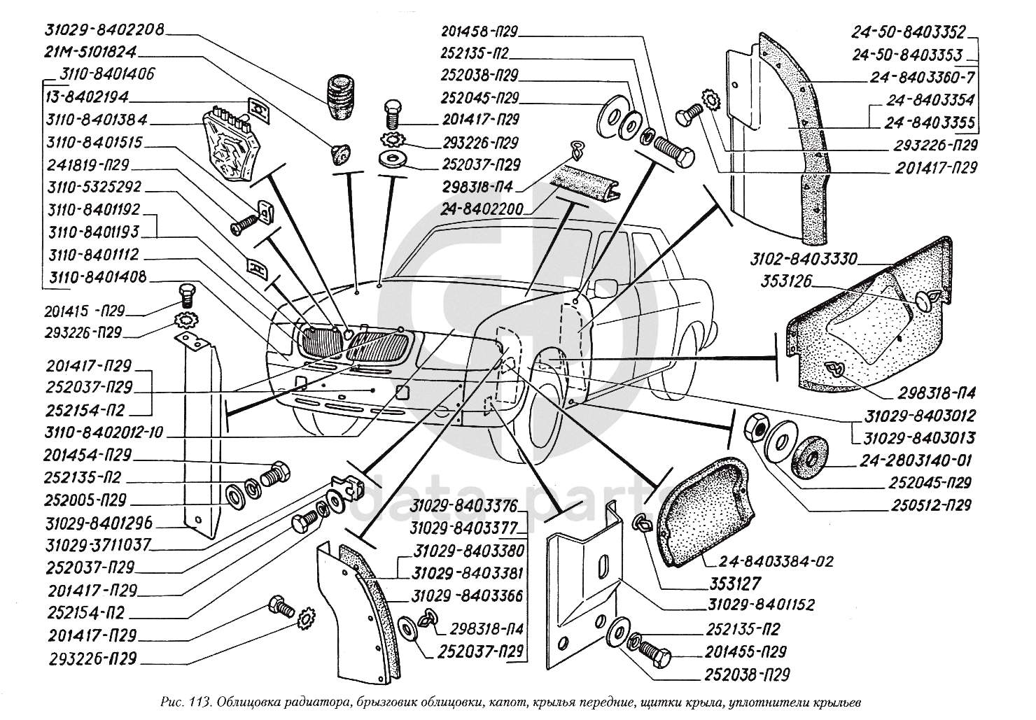 Облицовка радиатора, брызговик облицовки, капот, крылья передние, щитки крыла, уплотнители крыльев ГАЗ-3110