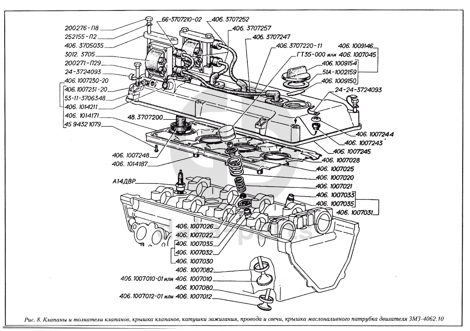 Клапаны и толкатели клапанов, крышка клапанов, катушки зажигания, провода и свечи, крышка маслоналивного патрубка двигателя ЗМЗ-4062.10 ГАЗ-3110