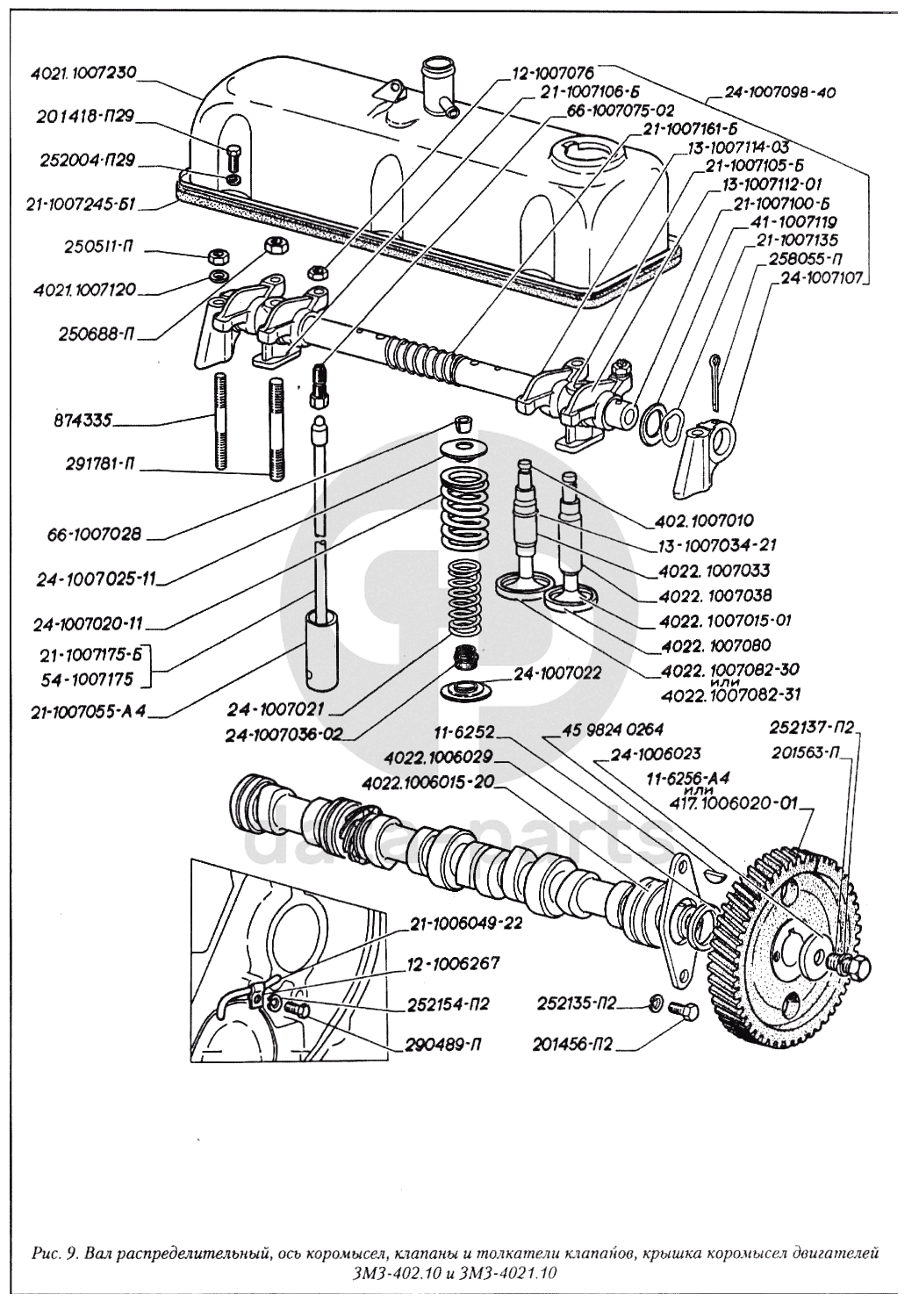 Вал распределительный, ось коромысел, клапаны и толкатели клапанов, крышка коромысел двигателей ЗМЗ-402.10 и ЗМЗ-4021.10 ГАЗ-3110