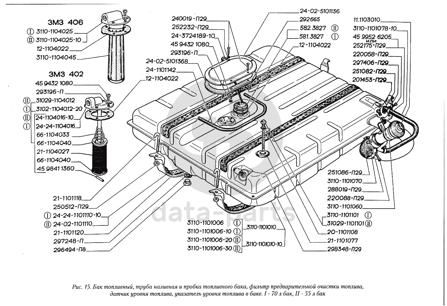 Бак топливный, труба наливная и пробка топливного бака, фильтр предварительной очистки топлива, датчик уровня топлива, указатель уровня топлива в баке. I - 70 л бак, II - 55 л бак ГАЗ-3110
