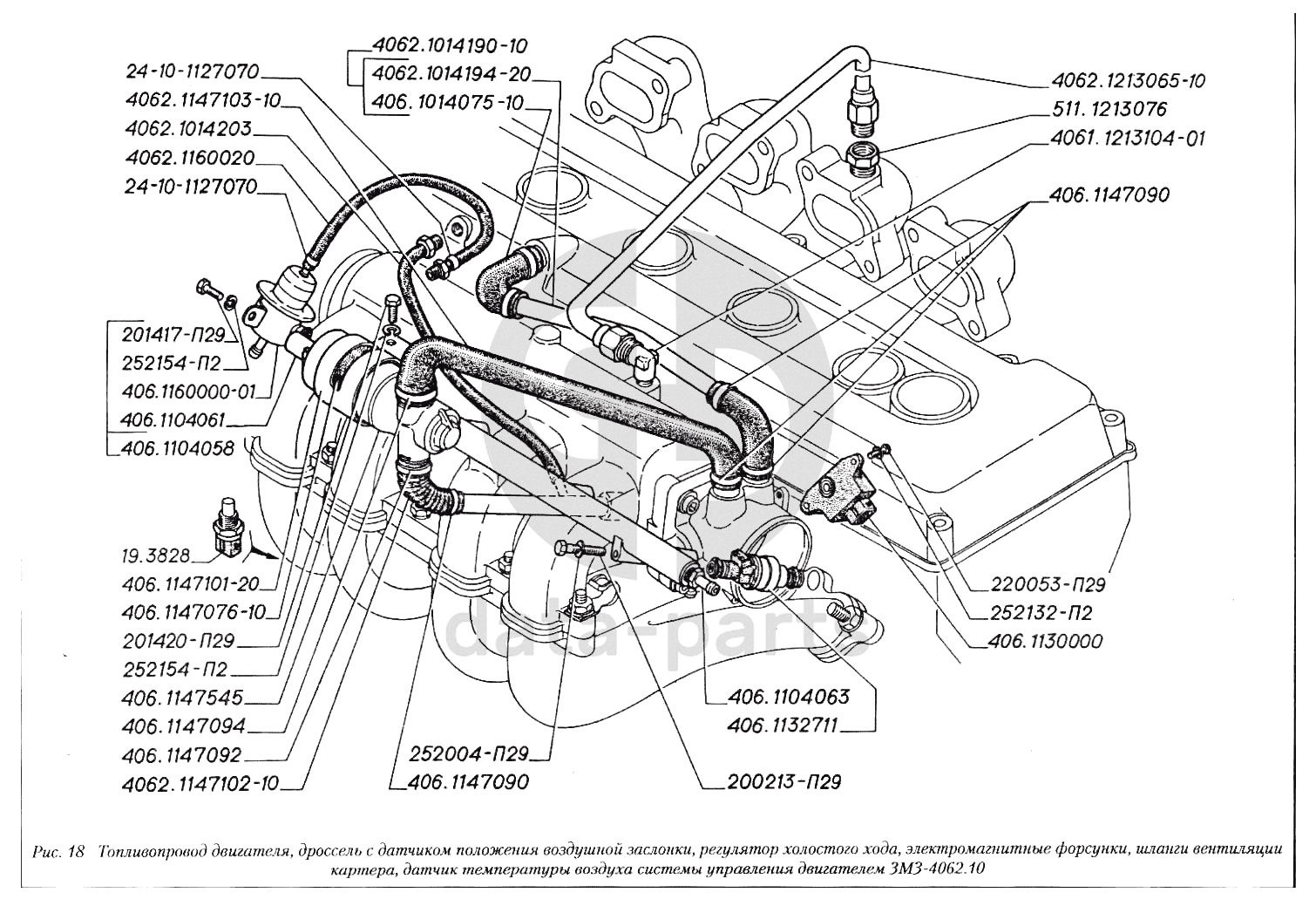 Топливопровод двигателя, дроссель с датчиком положения воздушной заслонки, регулятор холостого хода, электромагнитные форсунки, шланги вентиляции картера, датчик температуры воздуха системы управления двигателем ЗМЗ-4062.10 ГАЗ-3110