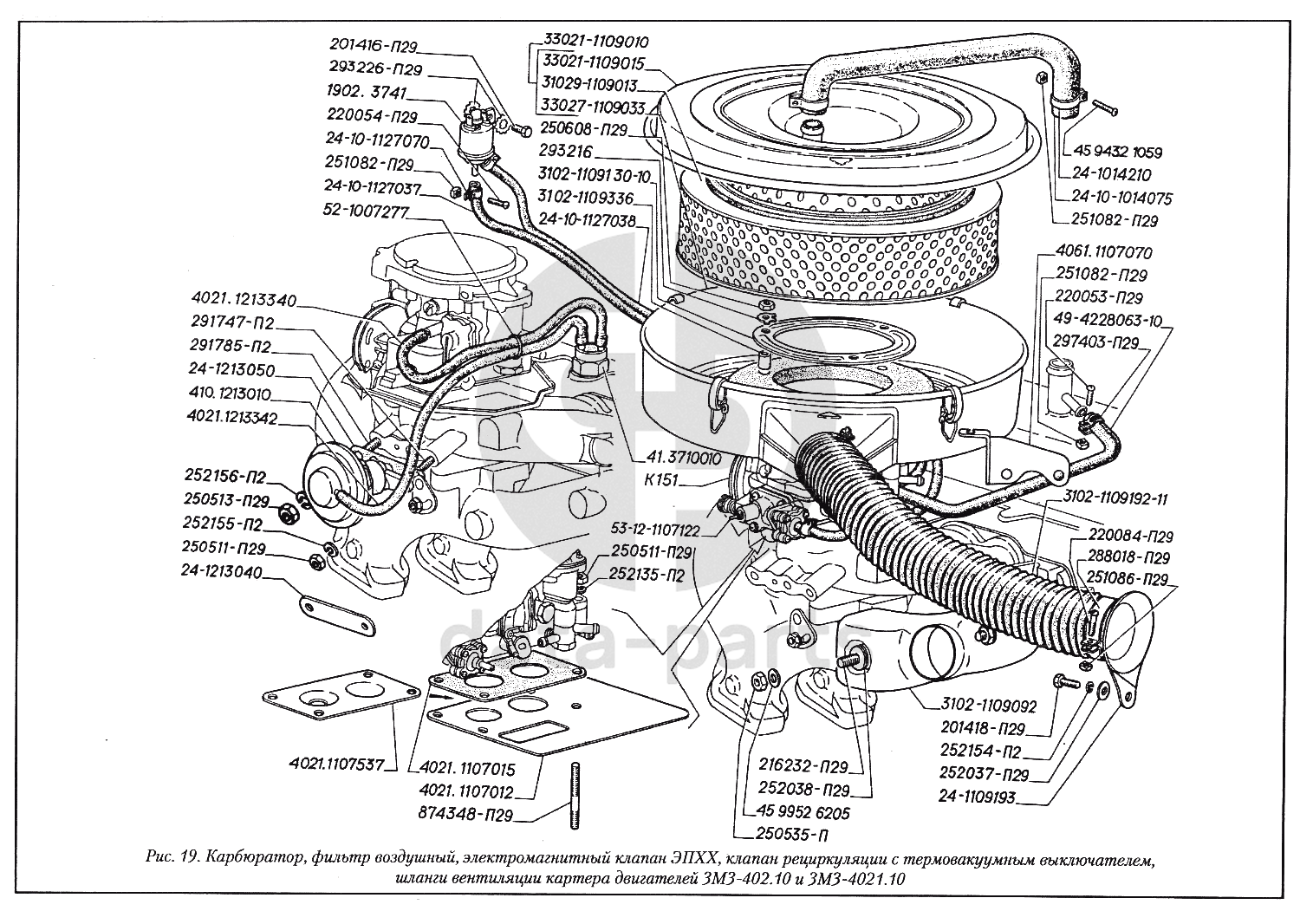 Карбюратор, фильтр воздушный, электромагнитный клапан ЭПХХ, клапан рециркуляции с термовакуумным выключателем, шланги вентиляции картера двигателей ЗМЗ-402.10иЗМЗ-4021.10 ГАЗ-3110