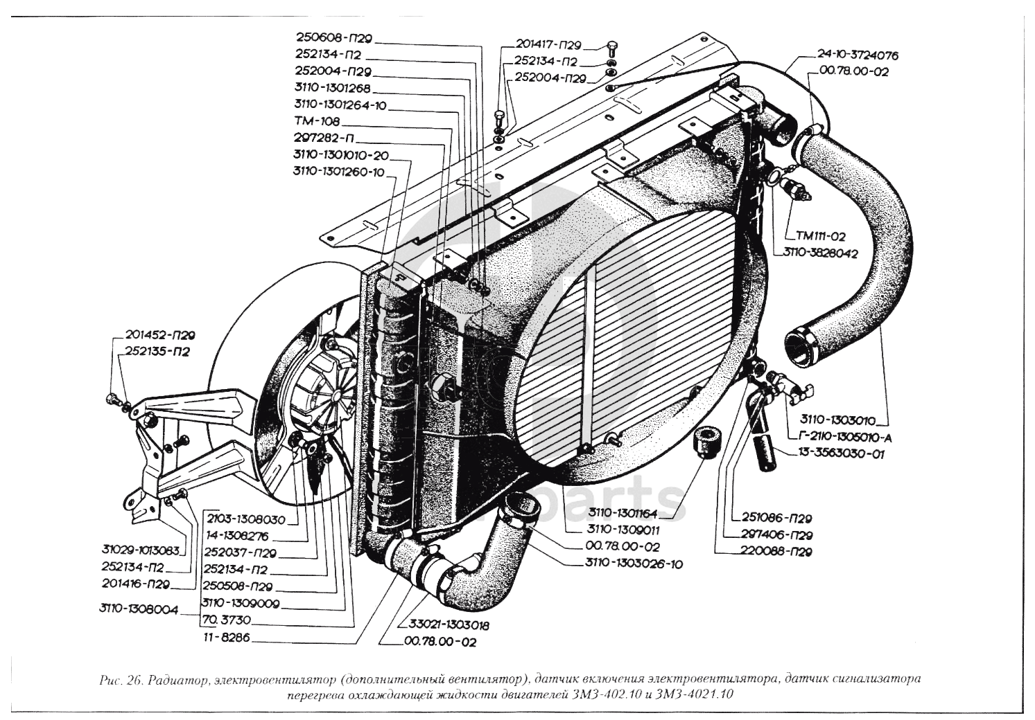 Радиатор, электровентилятор (дополнительный вентилятор), датчик включения электровентилятора, датчик сигнализатора перегрева охлаждающей жидкости двигателей ЗМЗ-402.10 и ЗМЗ-4021.10 ГАЗ-3110
