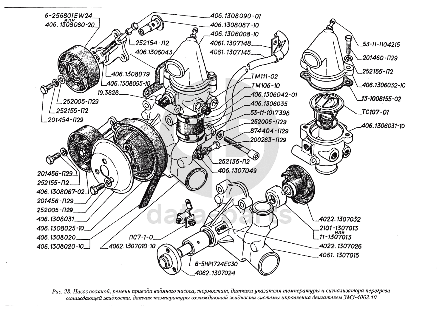 Насос водяной, ремень привода водяного насоса, термостат, датчики указателя температуры и сигнализатора перегрева охлаждающей жидкости, датчик указателя температуры охлаждающей жидкости системы управления двигателем ЗМЗ-4062.10 ГАЗ-3110