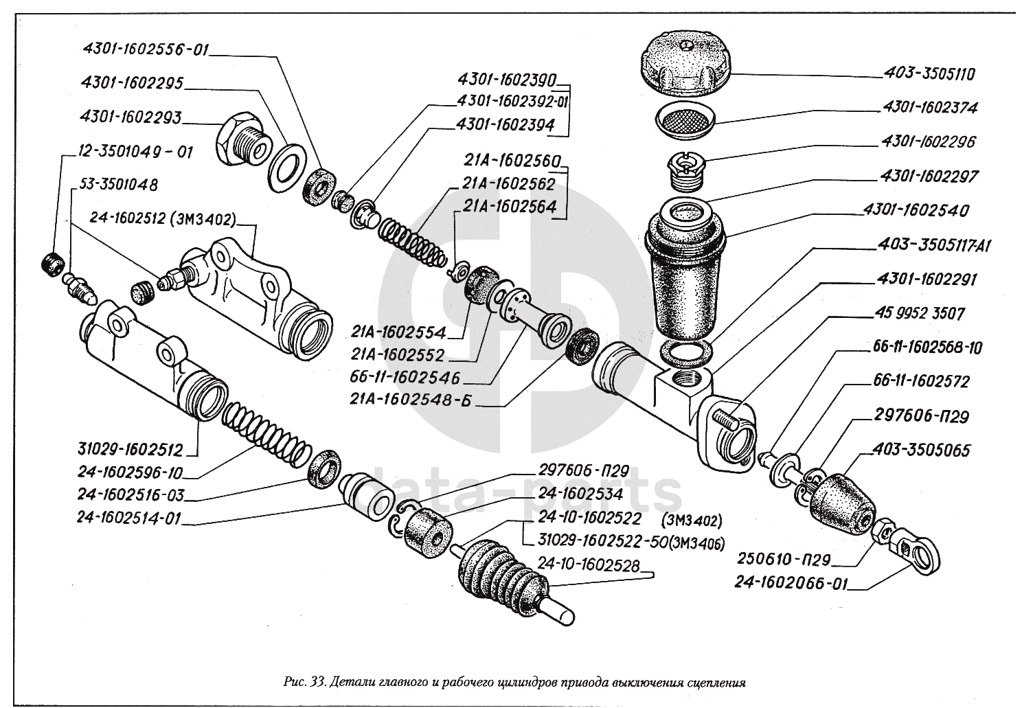 Детали главного и рабочего цилиндров привода выключения сцепления ГАЗ-3110