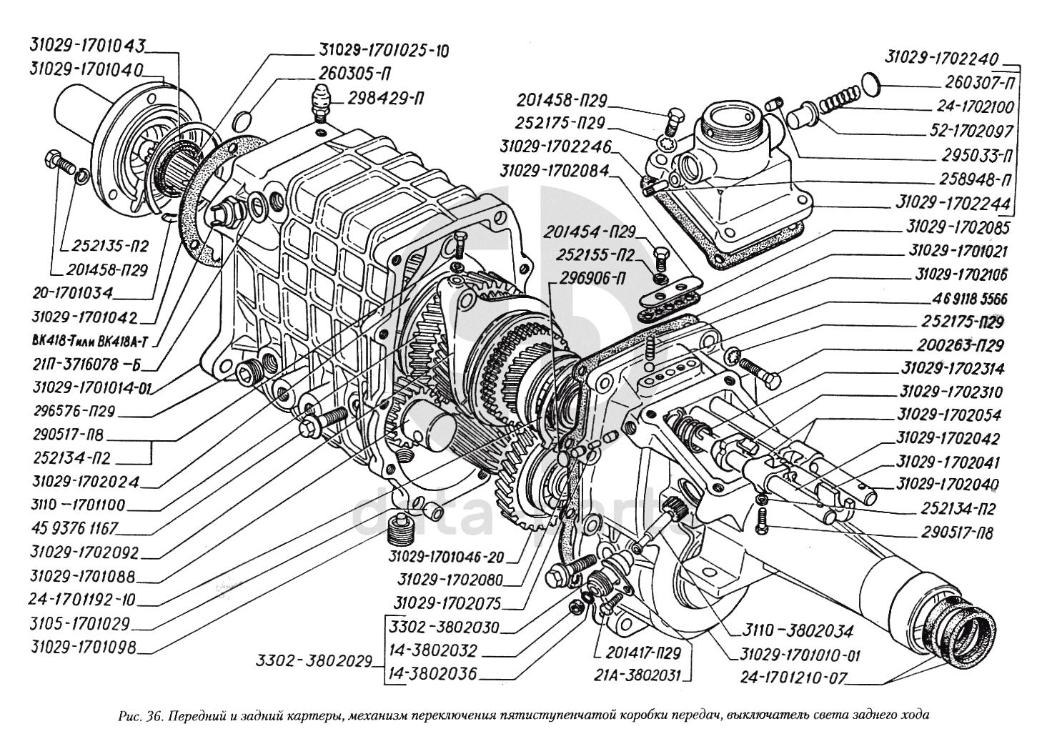 Передний и задний картеры, механизм переключения пятиступенчатой коробки передач, выключатель света заднего хода ГАЗ-3110