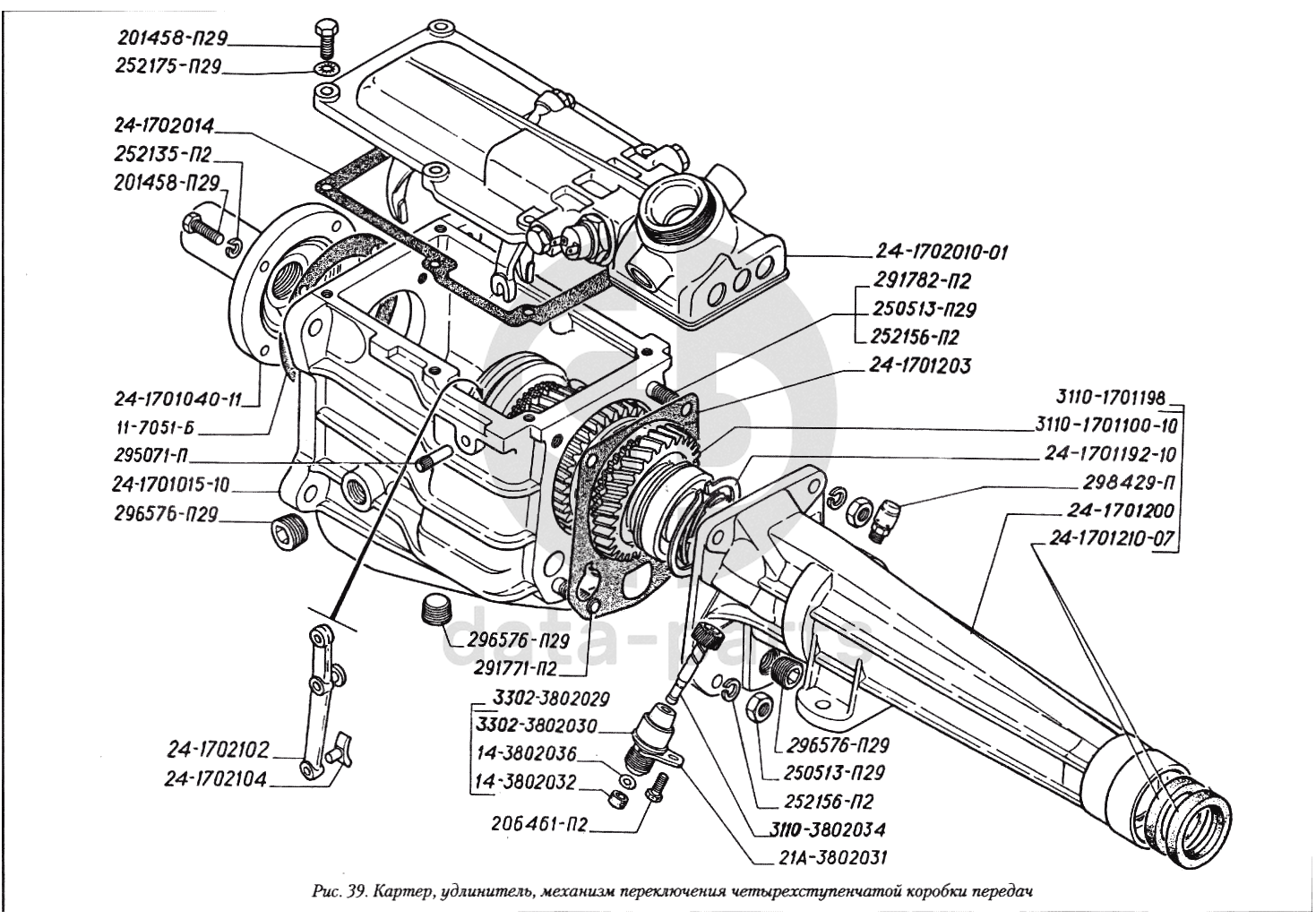 Картер, удлинитель, механизм переключения четырехступенчатой коробки передач ГАЗ-3110