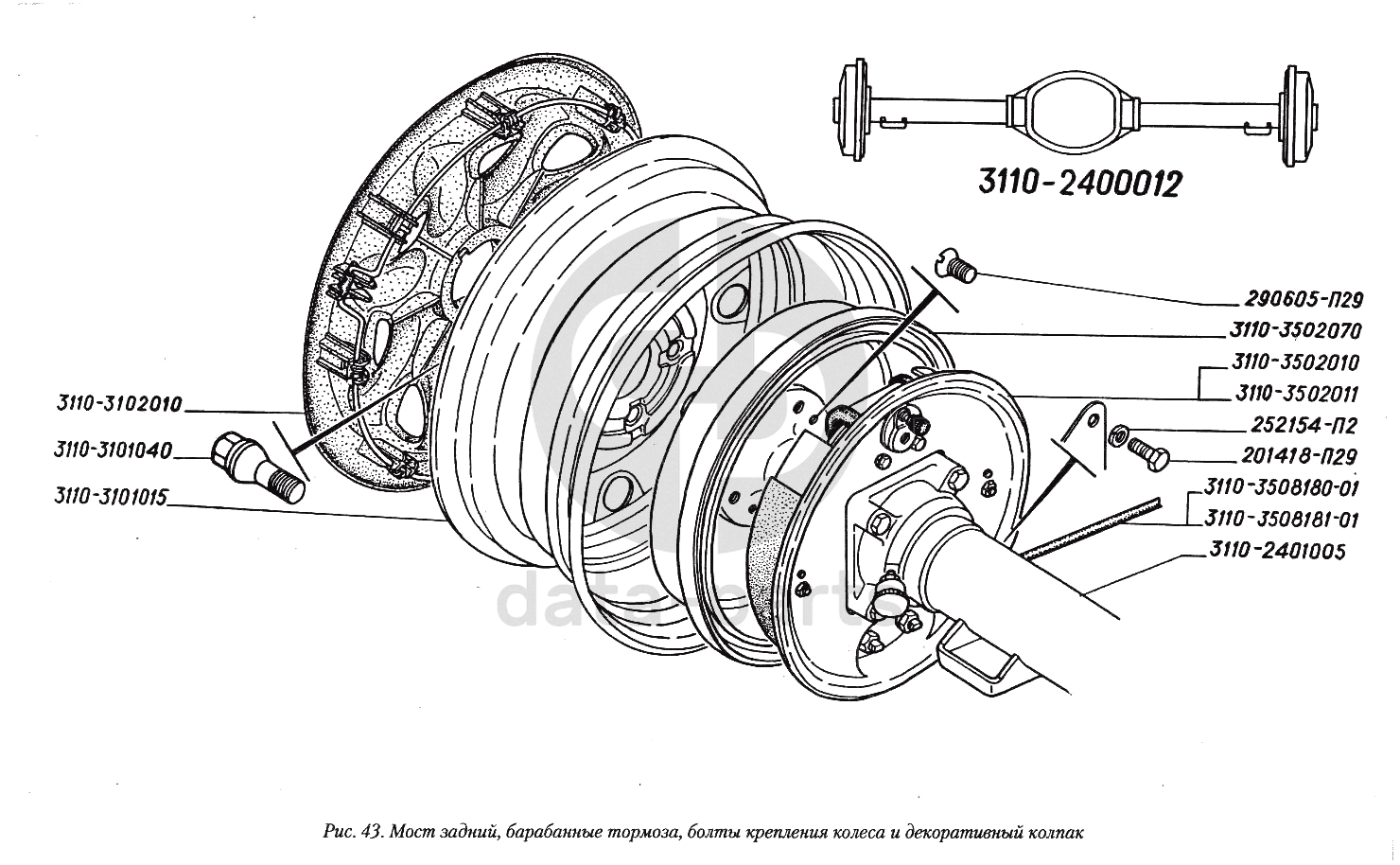 Мост задний, барабанные тормоза, болты крепления колеса и декоративный колпак ГАЗ-3110