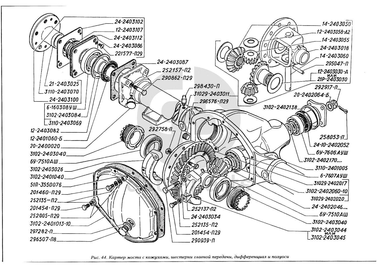 Картер моста с кожухами, шестерни главной передачи, дифференциал и полуоси ГАЗ-3110
