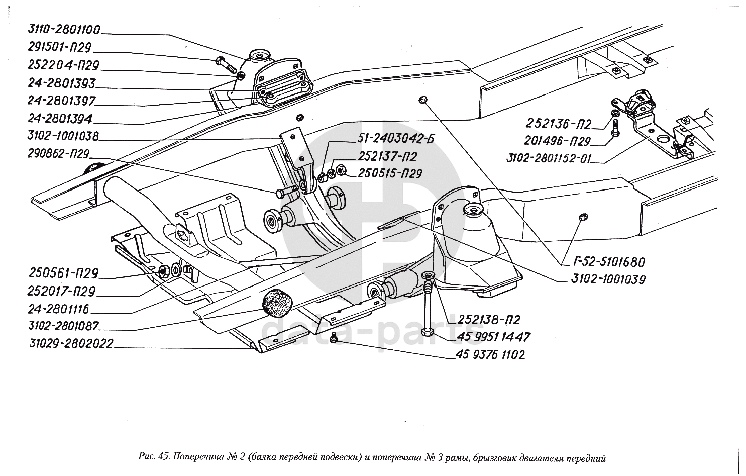 Поперечина № 2 (балка передней подвески) и поперечина № 3 рамы, брызговик двигателя передний ГАЗ-3110