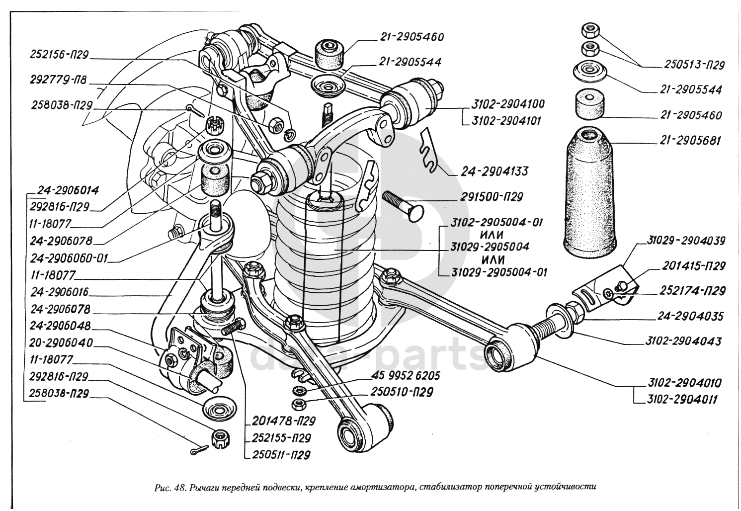 Рычаги передней подвески, крепление амортизатора, стабилизатор поперечной устойчивости ГАЗ-3110