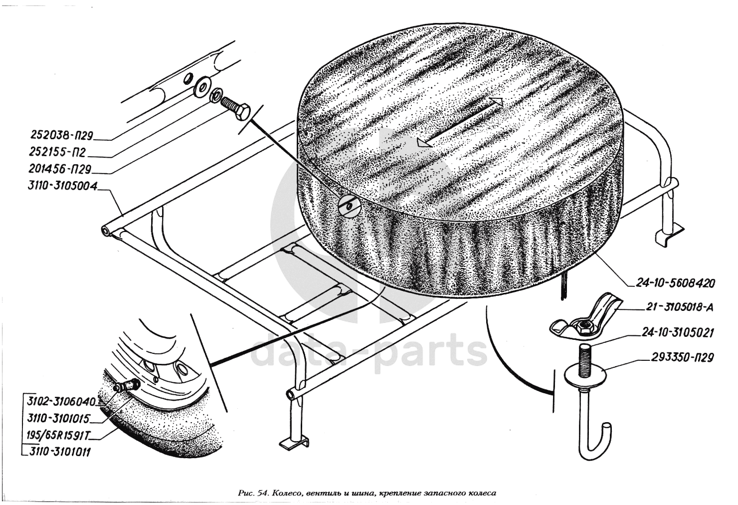 Колесо, вентиль и шина, крепление запасного колеса ГАЗ-3110