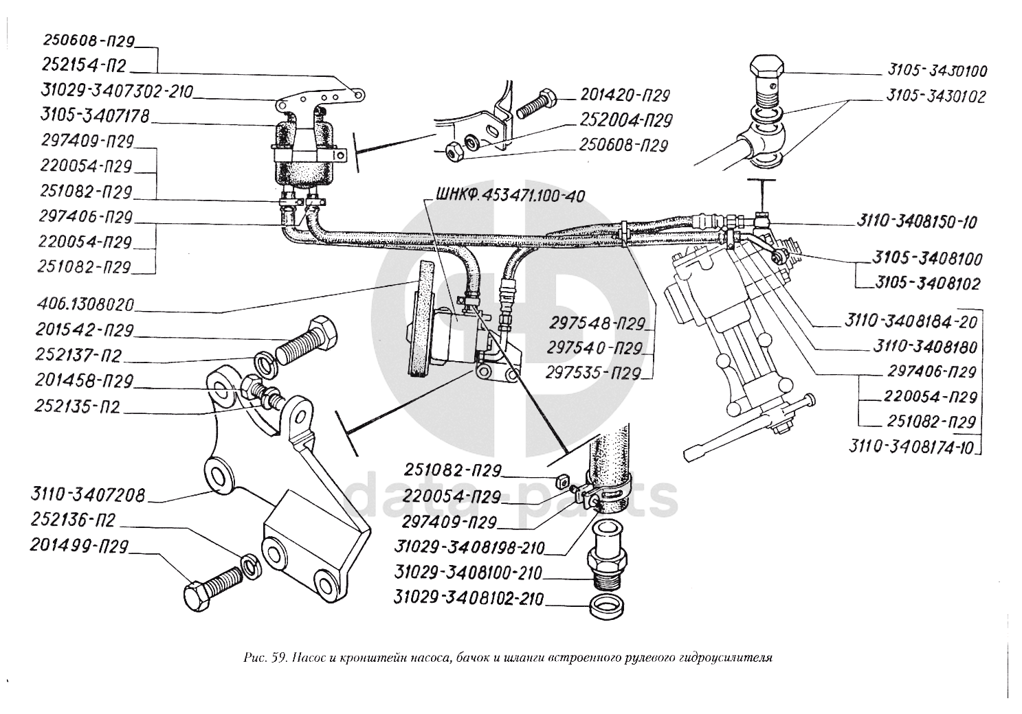 Насос и кронштейн насоса, бачок и шланги встроенного рулевого гидроусилителя ГАЗ-3110