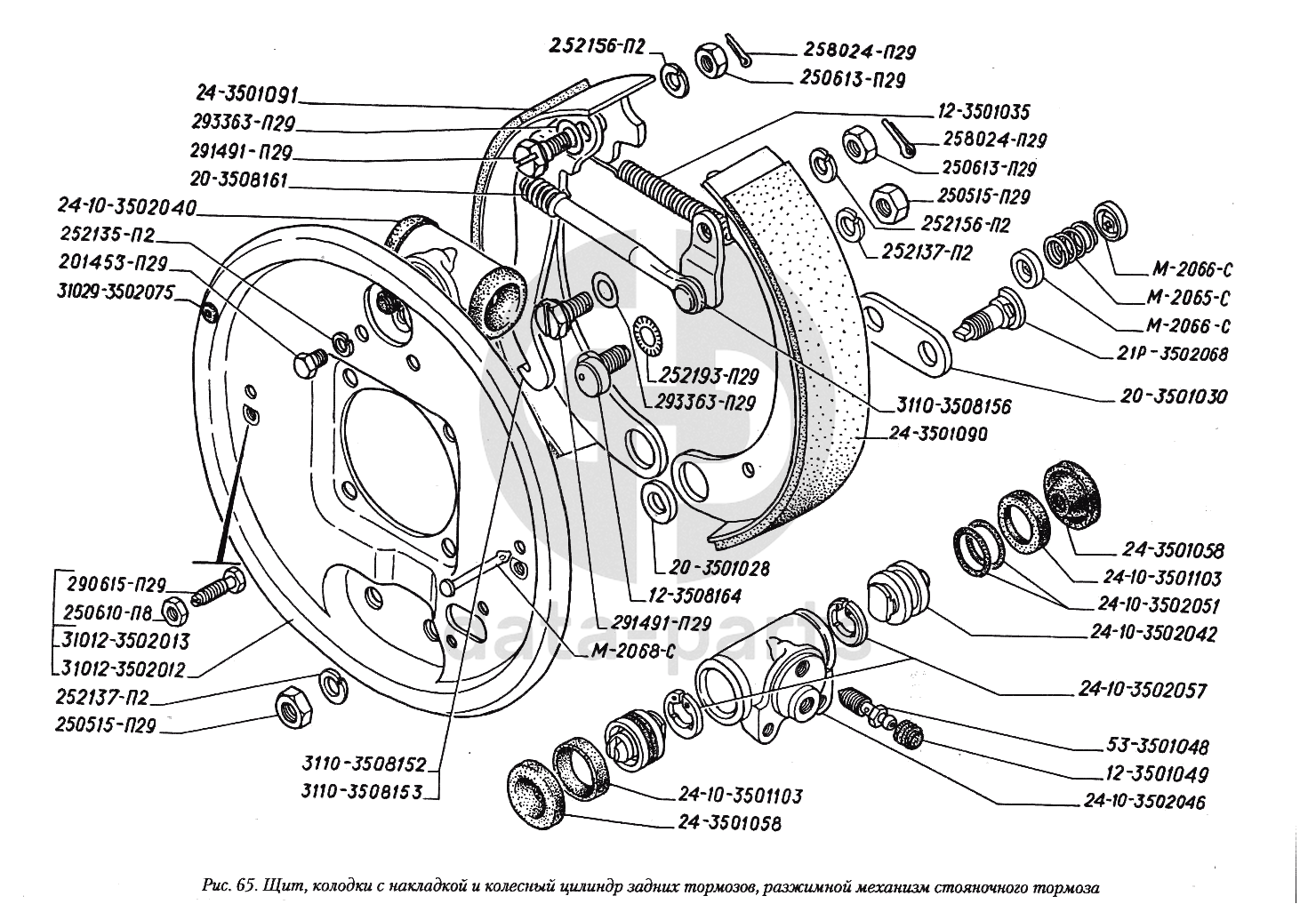 Щит, колодки с накладкой и колесный цилиндр задних тормозов, разжимной механизм стояночного тормоза ГАЗ-3110