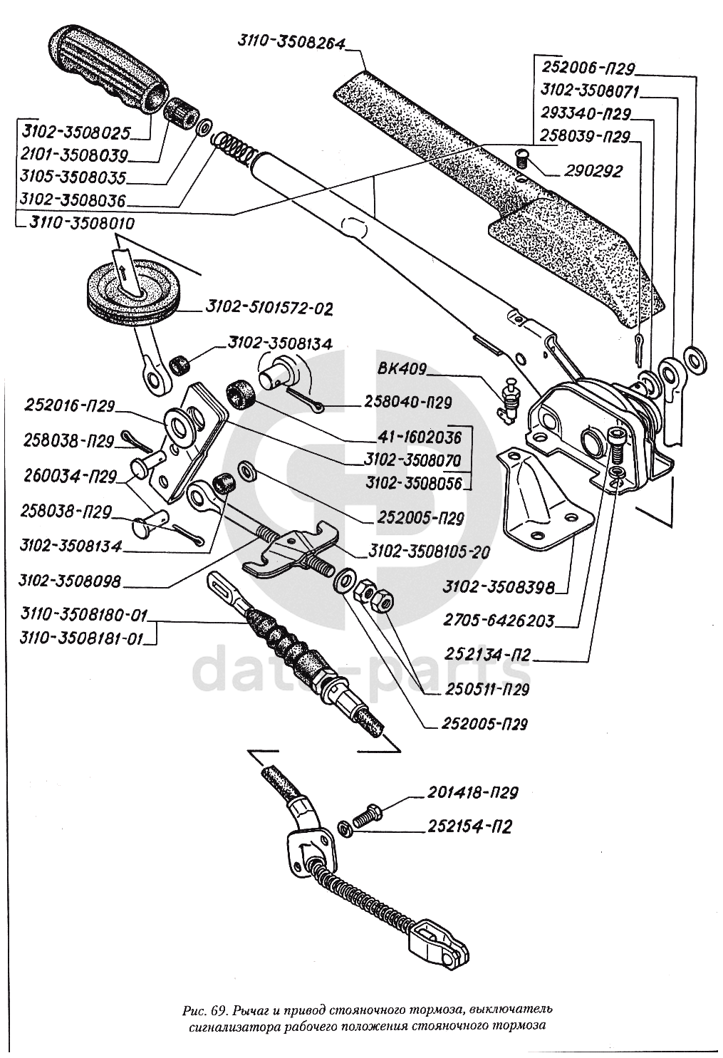Рычаг и привод стояночного тормоза, выключатель сигнализатора рабочего положения стояночного тормоза ГАЗ-3110