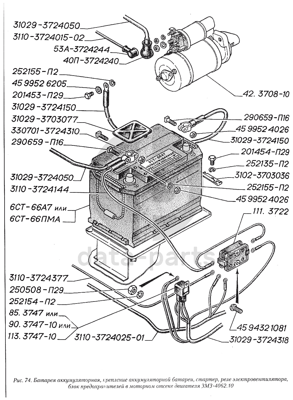 Батарея аккумуляторная, крепление аккумуляторной батареи, стартер, реле электровентилятора, блок предохранителей в моторном отсеке двигателя ЗМЗ-4062.10 ГАЗ-3110