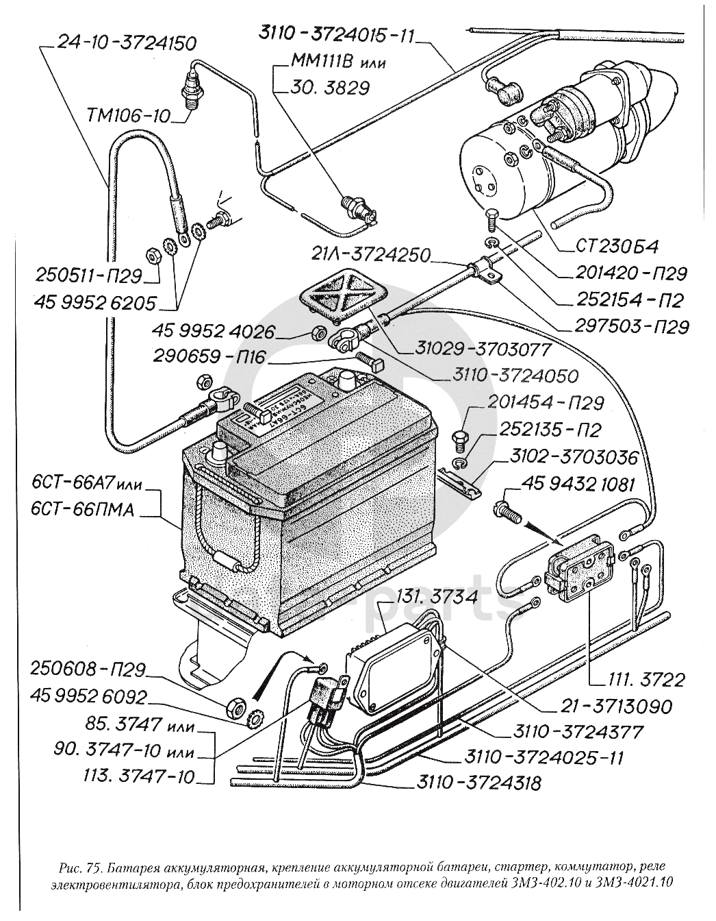 Батарея аккумуляторная, крепление аккумуляторной батареи, стартер, коммутатор, реле электровентилятора, блок предохранителей в моторном отсеке двигателей ЗМЗ-402.10иЗМЗ-4021.10 ГАЗ-3110