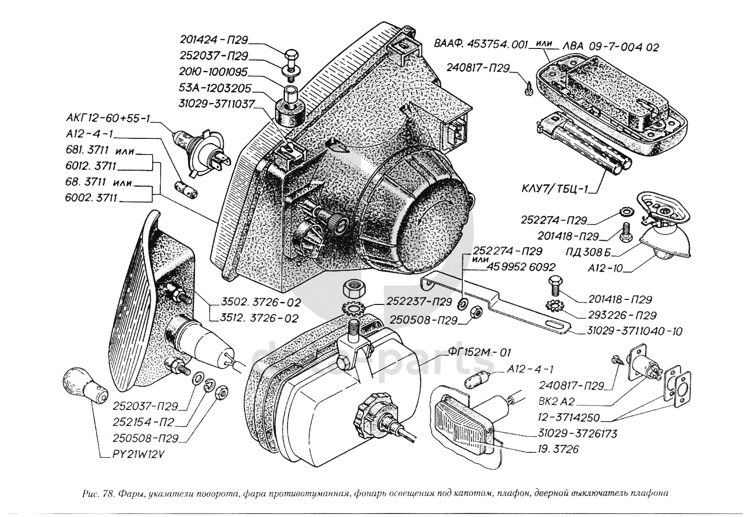 Фары, указатели поворота, фара противотуманная. Фонарь освещения под капотом, плафон, дверной выключатель плафона ГАЗ-3110