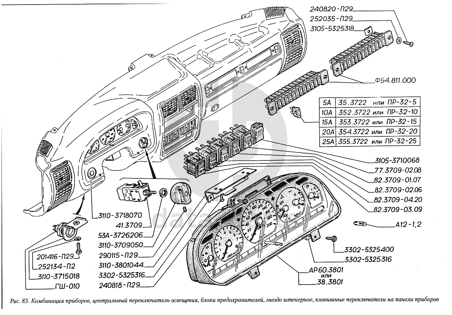 Комбинация приборов, центральный переключатель освещения, блоки предохранителей, гнездо штекерное, клавишные переключатели на панели приборов ГАЗ-3110