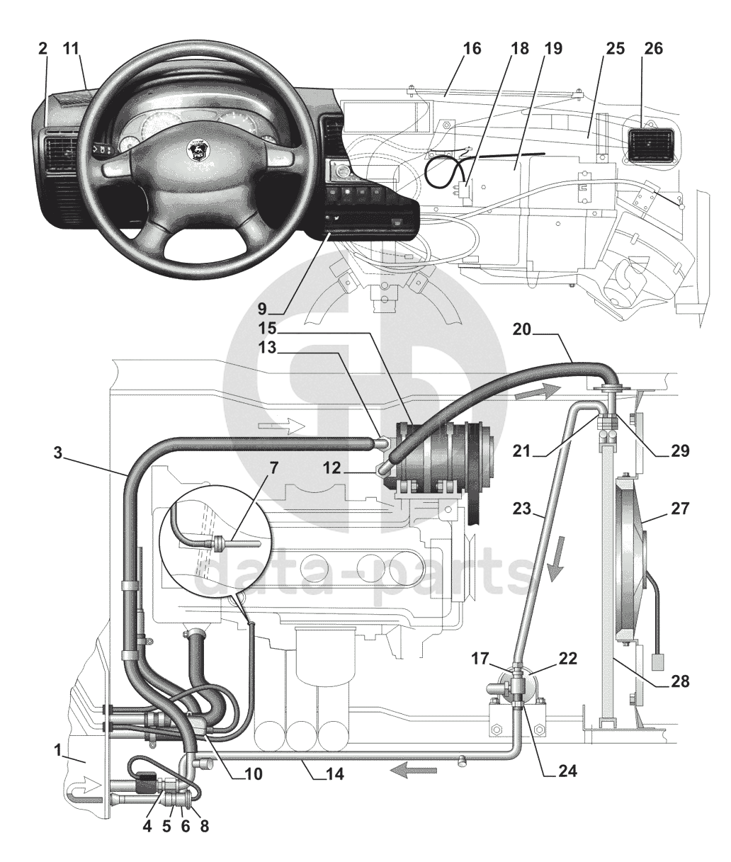 Расположение узлов и уплотнительных колец климатической установки автомобилей ГАЗ-31105, 3102 и их модификаций Установка климатическая