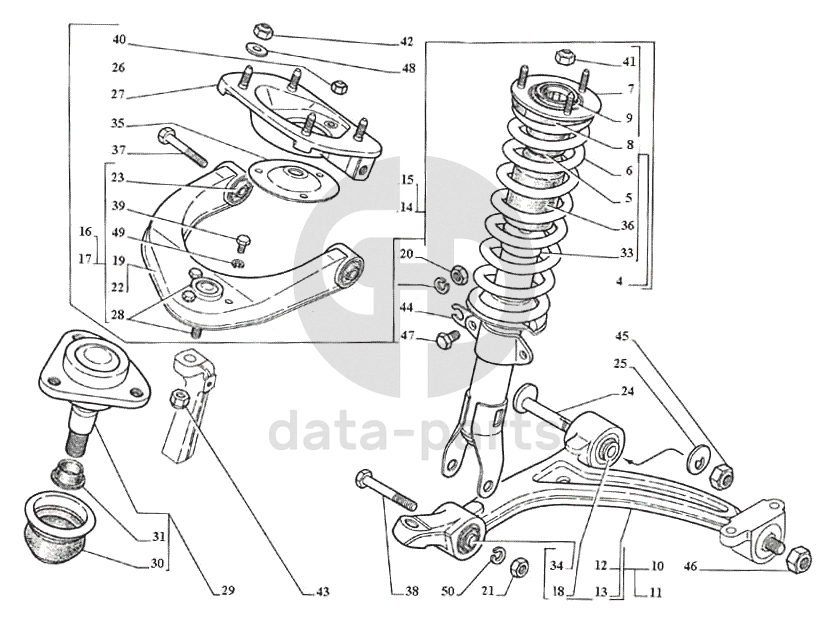 Рычаги передней подвески, пружина, буфер сжатия, шарнир подвески верхний, крепление амортизатора ГАЗ-3111