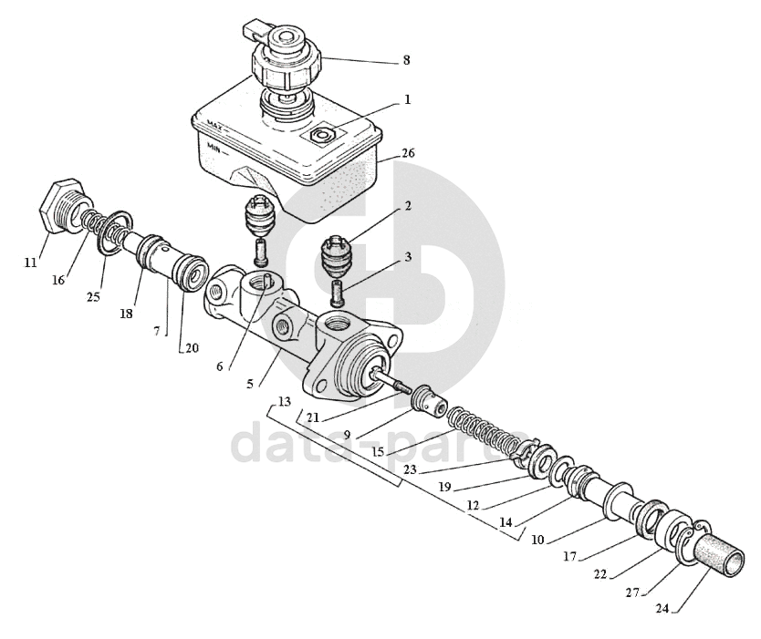 Детали главного цилиндра тормозов, датчик аварийного уровня тормозной жидкости ГАЗ-3111