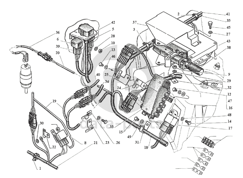 Блок управления, реле и жгут с разъемом диагностики системы управления двигателем, блок силовых предохранителей, реле стартера и реле включения электровентилятора ГАЗ-3111