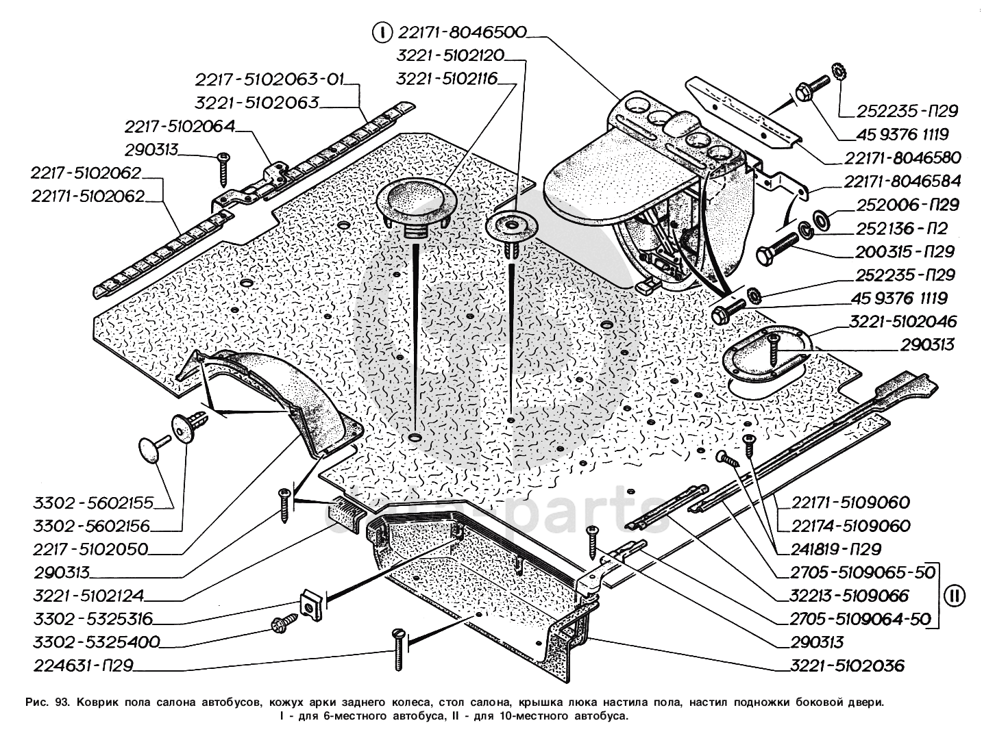 Коврик пола салона автобусов, кожух арки заднего колеса, стол салона, крышка люка настила пола, настил подножки боковой двери: I - для 6-местного автобуса, II - для 10-местного автобуса ГАЗ-2217 (Соболь)