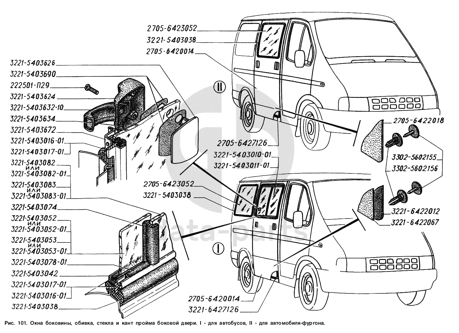 Окна боковины, обивка, стекла и кант проема боковой двери: I - для автобусов, II - для автомобиля-фургона ГАЗ-2217 (Соболь)