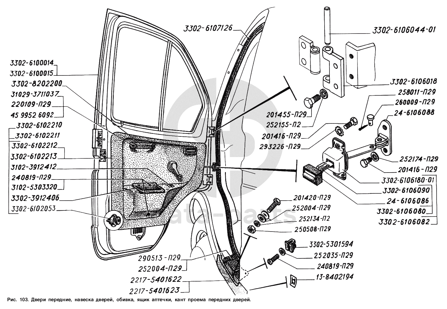 Двери передние, навеска дверей, обивка, ящик аптечки, кант проема передних дверей ГАЗ-2217 (Соболь)