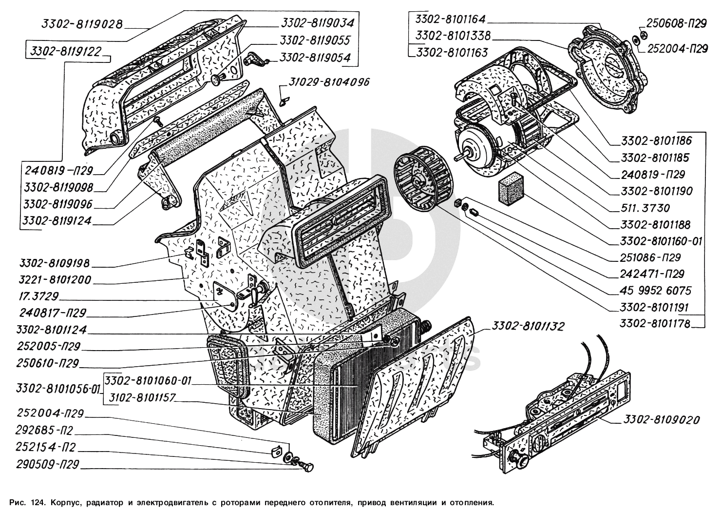 Корпус, радиатор и электродвигатель с роторами переднего отопителя, привод вентиляции и отопления ГАЗ-2217 (Соболь)