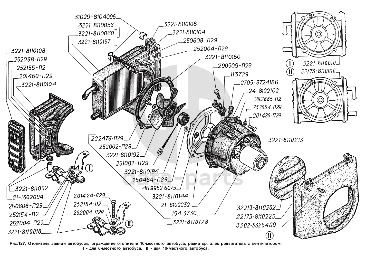 Отопитель задний автобусов, ограждение отопителя 10-местного автобуса, радиатор, электродвигатель с вентилятором: I - для 6-местного автобуса, II -для 10-местного автобуса ГАЗ-2217 (Соболь)