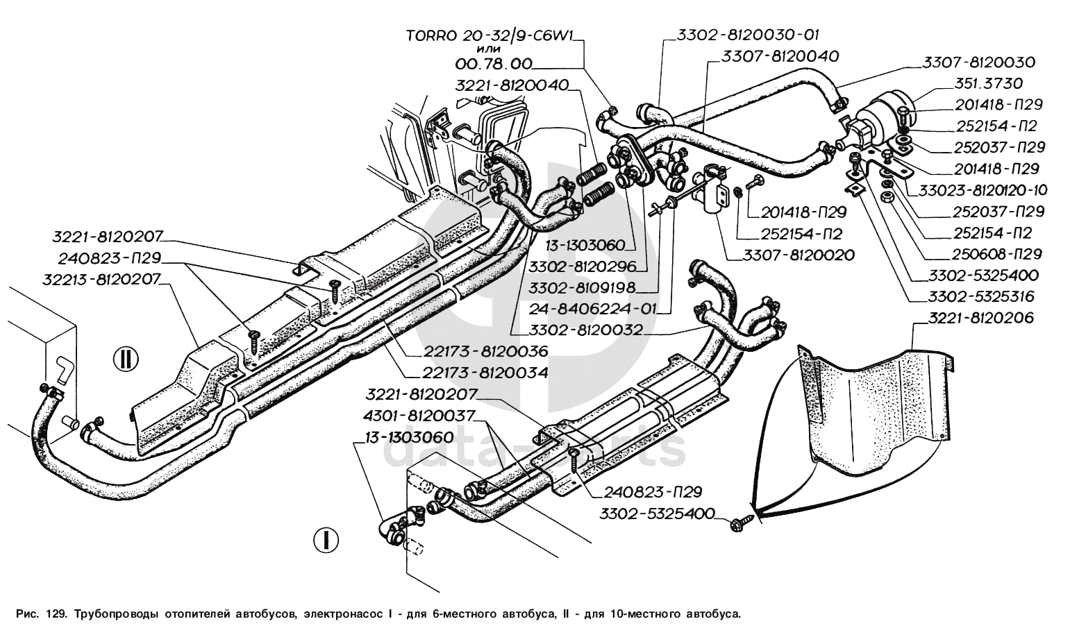 Трубопроводы отопителей автобусов, электронасос I - для 6-местного автобуса. II -для 10-местного автобуса ГАЗ-2217 (Соболь)