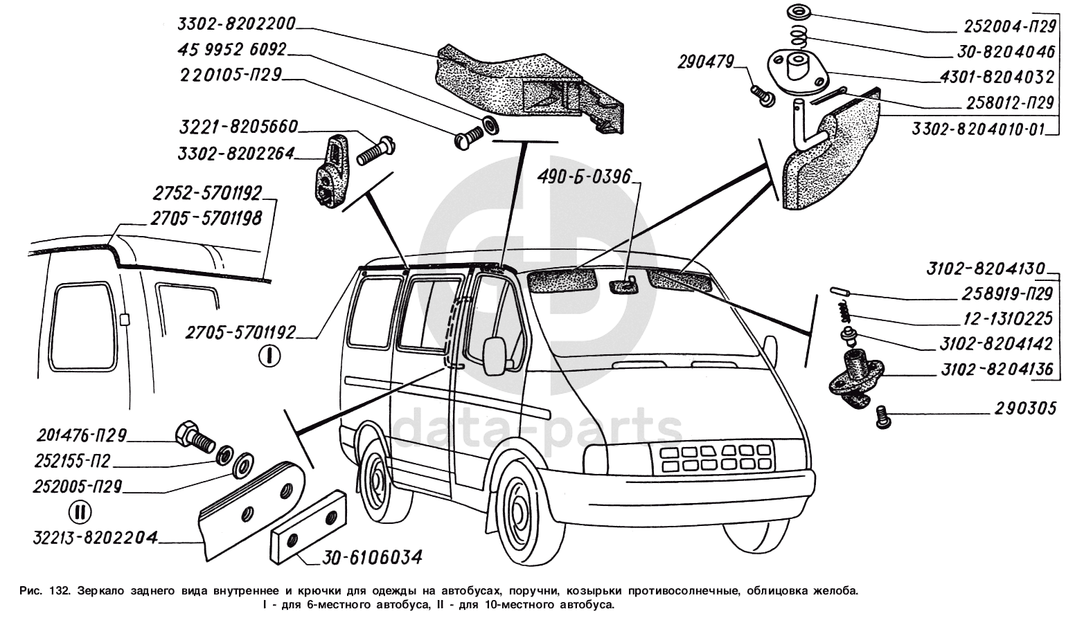 Зеркало заднего вида внутреннее и крючки для одежды на автобусах, поручни, козырьки противосолнечные, облицовка желоба: I - для 6-местного автобуса, II - для 10-местного автобуса ГАЗ-2217 (Соболь)
