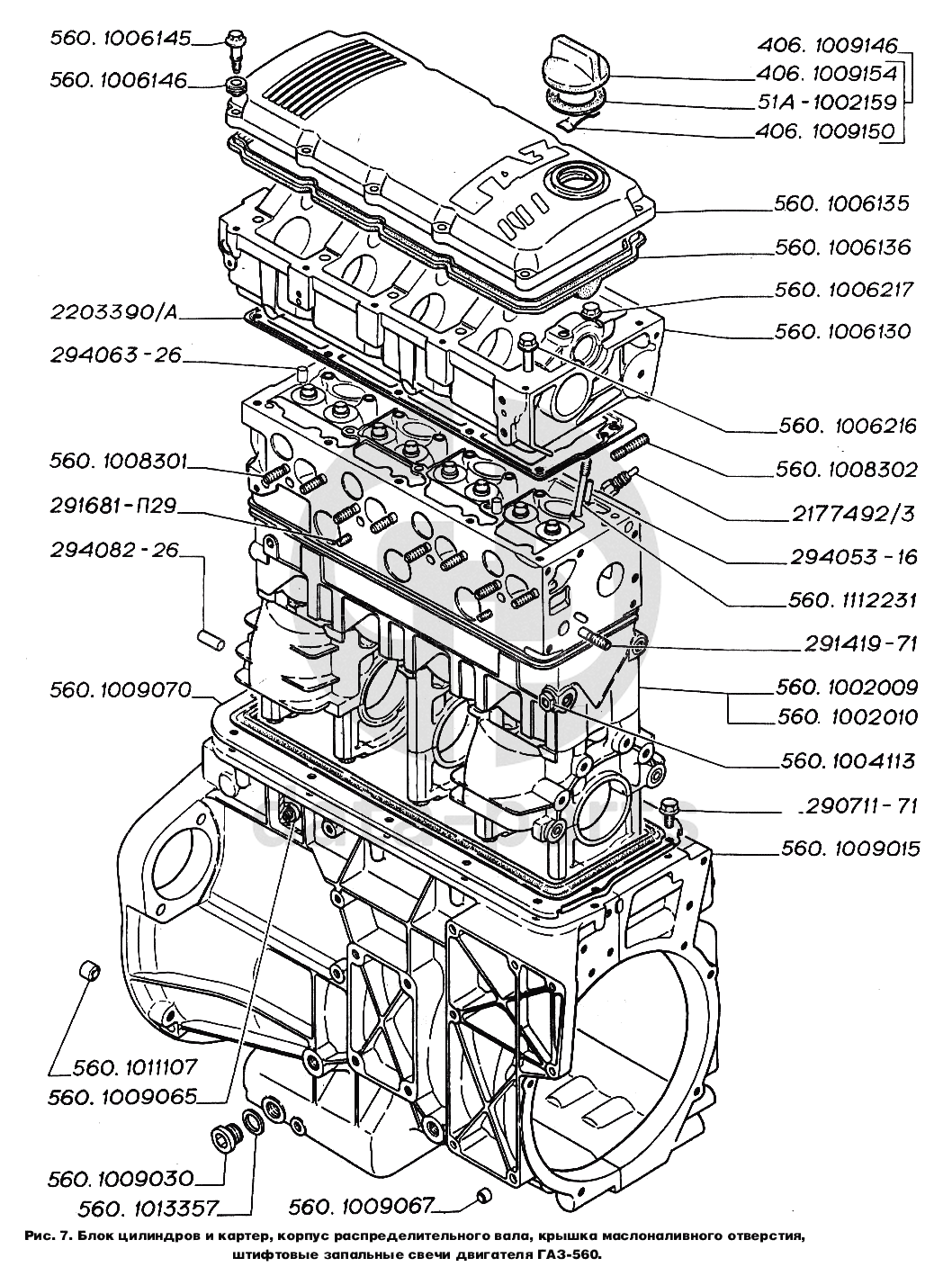 Блок цилиндров и картер, корпус распределительного вала, крышка маслоналивного отверстия, штифтовые запальные свечи двигателя ГАЗ-560 ГАЗ-2217 (Соболь)
