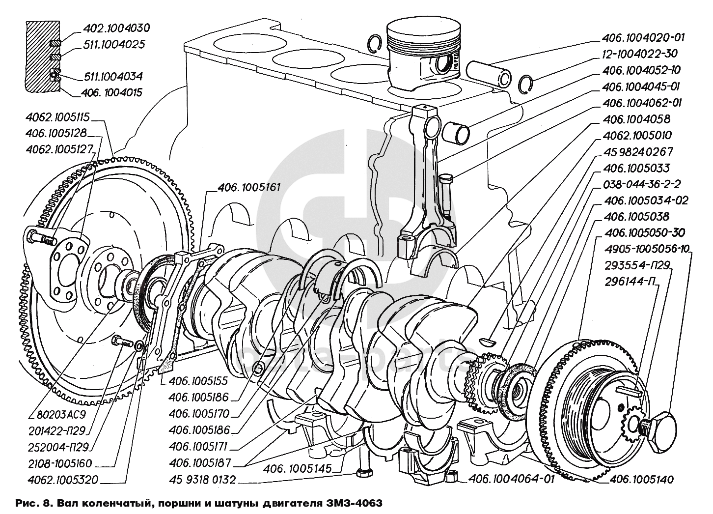 Вал коленчатый, поршни и шатуны двигателя ЗМЗ-4063 ГАЗ-2217 (Соболь)