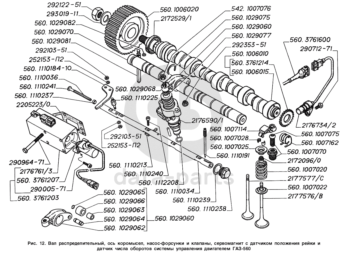 Вал распределительный, ось коромысел, насос-форсунки и клапаны, сервомагнит с датчиком положения рейки и датчик числа оборотов системы управления двигателем ГАЗ-560 ГАЗ-2217 (Соболь)