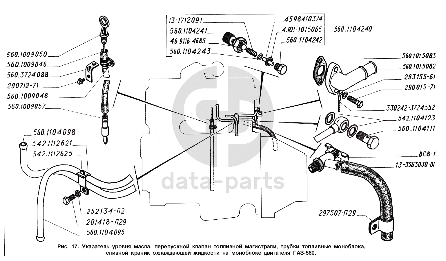 Указатель уровня масла, перепускной клапан топливной магистрали, трубки топливные моноблока, сливной краник охлаждающей жидкости на моноблоке двигателя ГАЗ-560 ГАЗ-2217 (Соболь)
