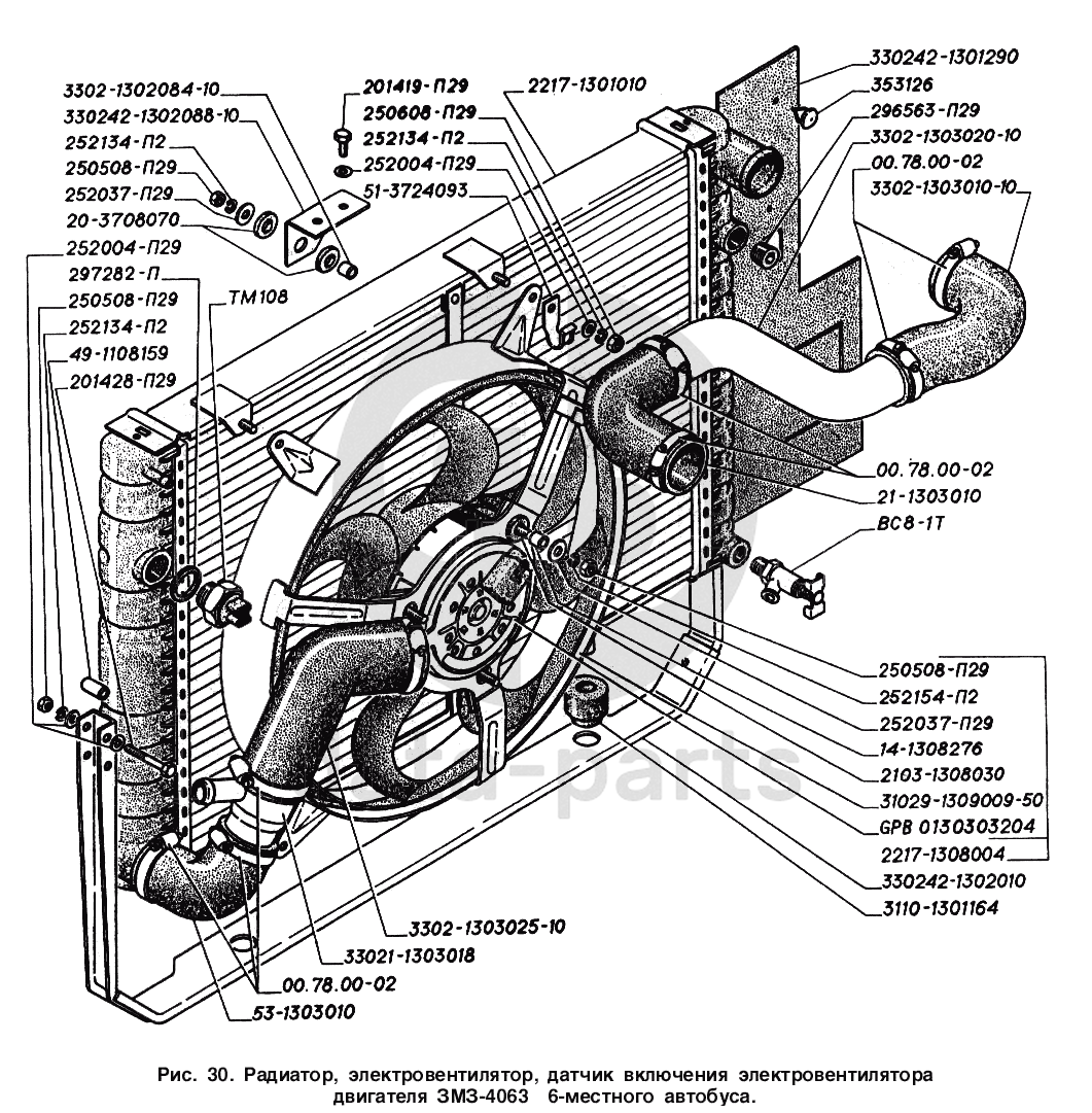 Радиатор, электровентилятор, датчик включения электровентилятора двигателя ЗМЗ-4063 6-b местного автобуса ГАЗ-2217 (Соболь)