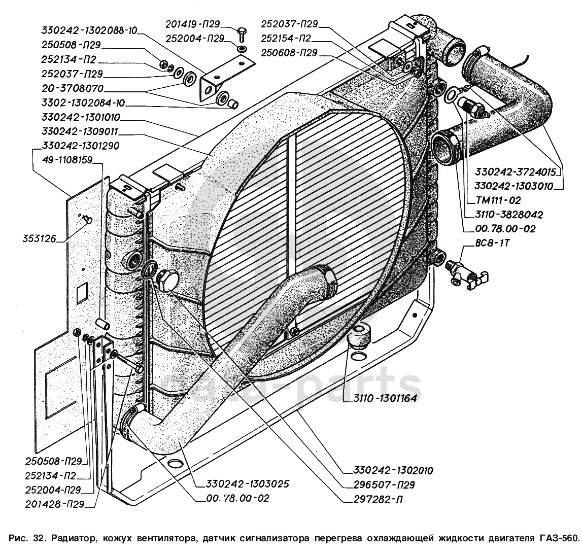 Радиатор, кожух вентилятора, датчик сигнализатора перегрева охлаждающей жидкости двигателя ГАЗ-560 ГАЗ-2217 (Соболь)